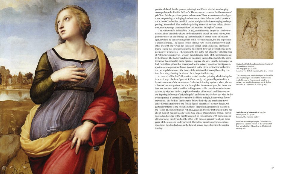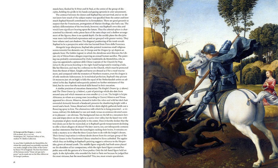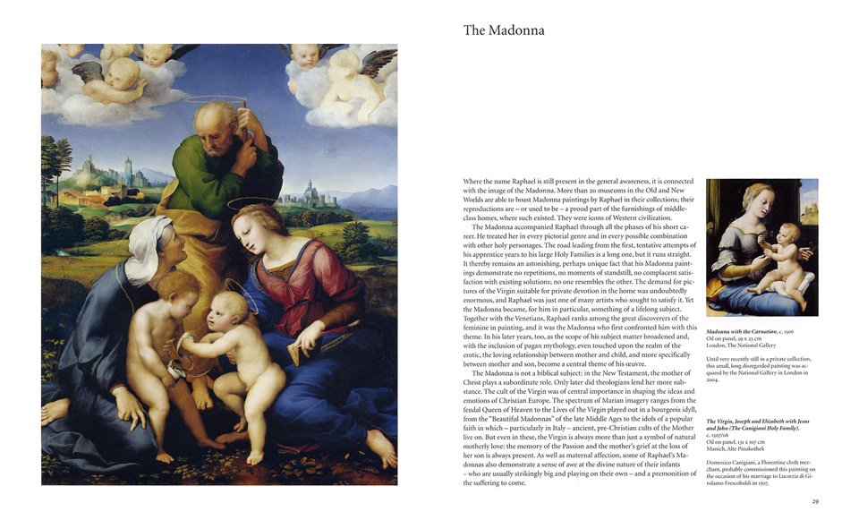 Classic grace and human grandeur Influenced by his contemporaries Michelangelo and Leonardo, Raphael Santi (1483-1520) became, in his own right, one of the most important artists of the High Renaissance. Though Raphael painted many important works in his Florence period, including his famous Madonnas, it was his mature work in Rome that cemented his place in history, most notably the Stanza della Segnatura in the Vatican featuring his School of Athens and Triumph of Religion murals. This overview traces the life`s work of this Renaissance master who achieved the height of greatness in only two decades of creation and whose influential work paved the way for the Mannerist and Baroque movements. |