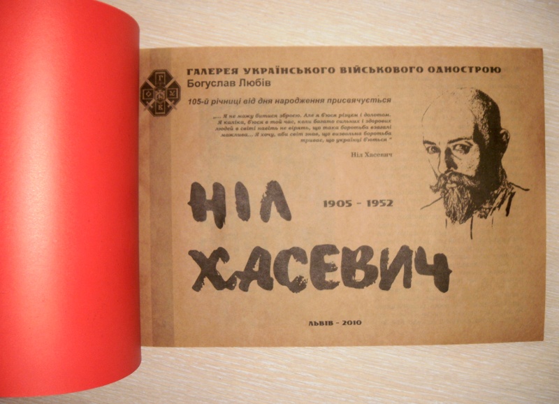 Слідом за чудовим альбомом робіт майстра графіки та пропаганди Ніла Хасевича від видавництва «Терен», мені до рук потрапив інший альбом того ж року випуску від іншого видавництва. Маю нагоду порівняти один з іншим, тож тут опишу лиш саме технічне та естетичне виконання книги. Перше, що кидається у вічі — темний поштовий папір (чи то крафт-папір), на якому надрукований альбом. Чудова ідея, покликана передати антураж давності та підпільності. Але на жаль, на цьому втілення цієї ідеї й зупинилось. Бо в альбомі бачимо статті, недбало набрані гарнітурою Arial, з помилками, зайвими пробілами та дефісами замість тире, фотографії та живопис, переведені в чорно-білий формат, які на такому папері виглядають розмитими плямами (можливо, тут виною в тому числі невміла підготовка до друку). Деякі роботи, особливо екслібриси, зменшені до такої міри, що їх важко розібрати, теж завдяки фактурі паперу. Варто було обмежитись лише чорно-білою графікою та не тулити по кілька робіт на сторінку. Наявність тексту — біографічної довідки — не проблема, а навіть плюс, якби його типографіку хоча б спробували адаптувати під дух альбому. Інакше слід було взяти звичайний білий папір. Можливо, і не було ніякої ідеї, а поштовий папір взяли просто бо завалявся на складі? Картину недбальства доповнює плутанина з сторінками: на початку альбому вони незрозумілим чином переплутуються та повторюються. Але вінцем жлобства тут є нав’язлива реклама музею «Галерея українського військового однострою». Саме нав’язлива, бо ми зустрічаємо її на обкладинці та авантитулі, бачимо рекламну статтю про музей на початку, упорядник та автор біографічної довідки неодноразово згадує про нього в тексті, далі розміщено кілька розмитих фото з музею (під якими обов’язково написана повна назва музею), і, щоб хто часом не забув, про який музей він щойно вдесяте прочитав, на кожній другій сторінці у колонтитулі розміщено його логотип. А потім іще на останній сторінці, в анотації, згадується повна назва музею. Розгадка одна — упорядник Богуслав Любів і є власник вищеназваного музею, чого він власне і не приховує. Але ж можна було обмежетись однією згадкою про цю галерею — тоді б реклама інтригувала, а так вона лиш викликає бажання оминати той музей десятою дорогою та перетворює альбом на рекламний буклет. А рекламні буклети заведено роздавати безкоштовно, а не продавати їх за гроші. Якщо ж проковтнути образу на творців альбому за змарновану ідею підпільного антуражу, то в залишку маємо чергове друковане видання із чудовими творами Ніла Хасевича, загальним числом 105. Більшість із них є в альбомі від Андрія Криштальського (в-во «Терен»), але не всі. Ті дереворити, що надруковані по одному-два на сторінку, на такому папері виглядають просто чудово.